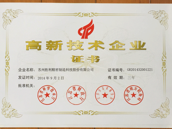 勝利精密榮獲江蘇省高新技術(shù)企業(yè)證書